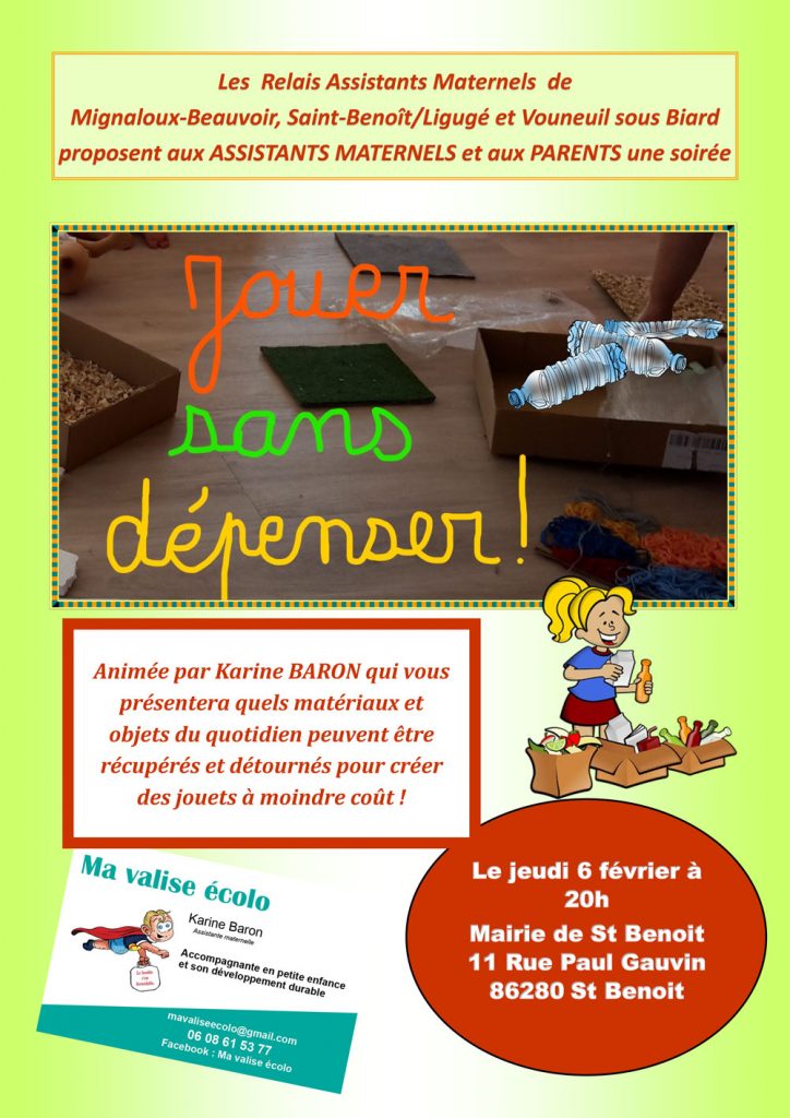 Thème de la conférence: Jouer économiquement et écologiquement Le jeudi 6 février 20h-22h à la Mairie de Saint Benoit pour les relais assistants maternels de Ligugé-Saint